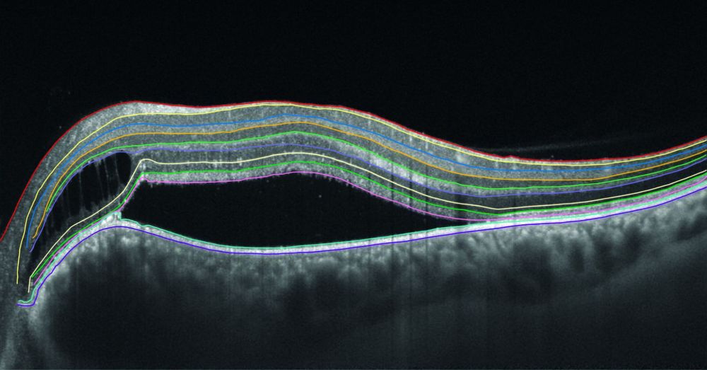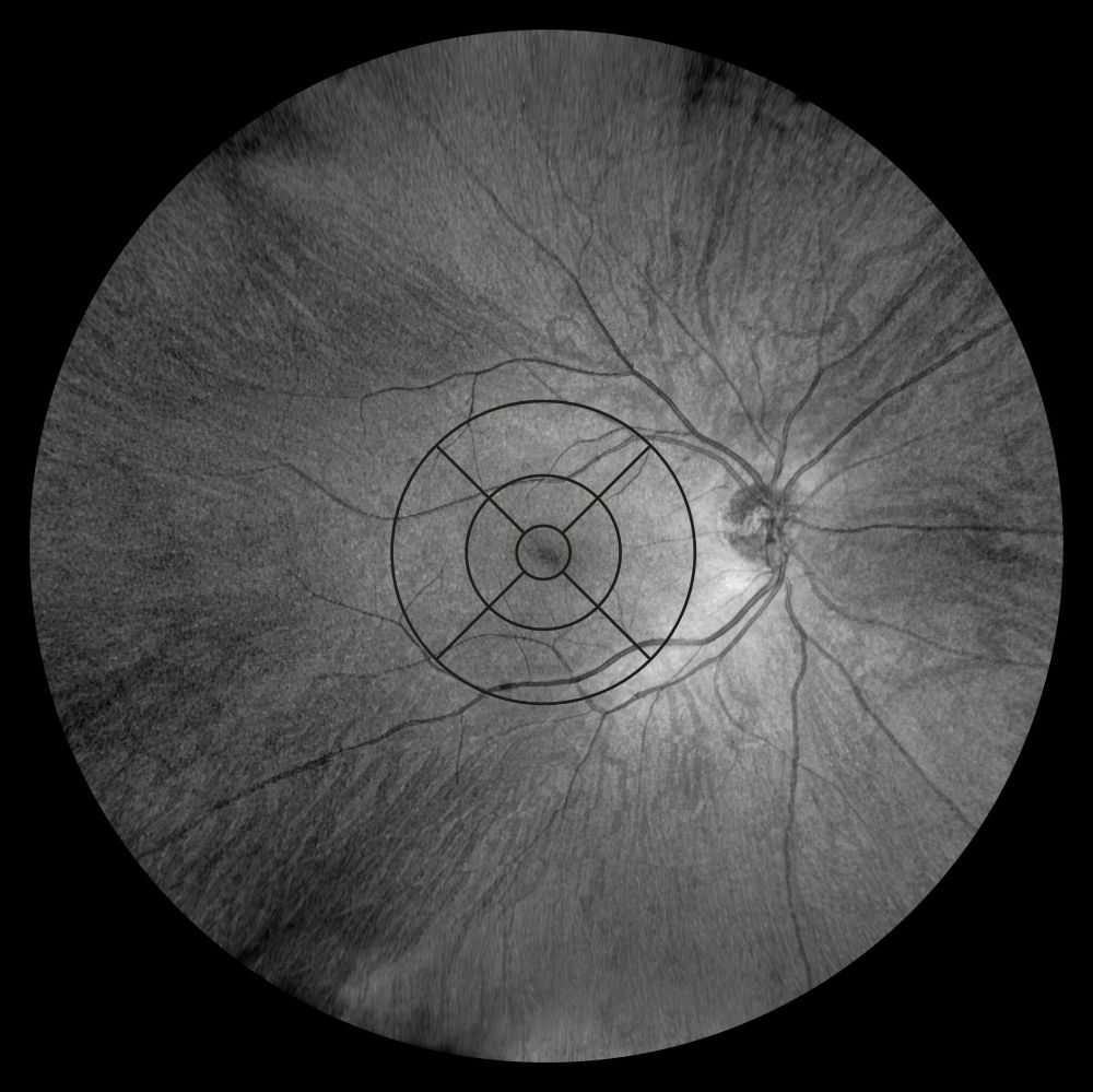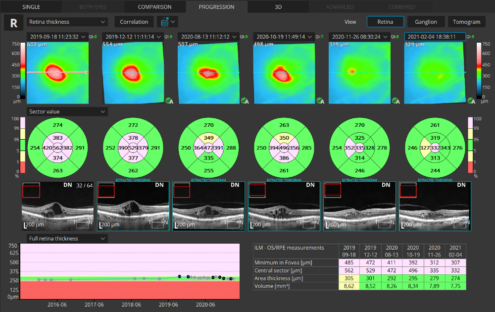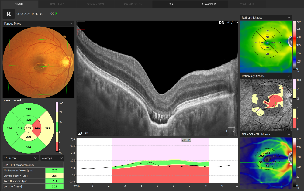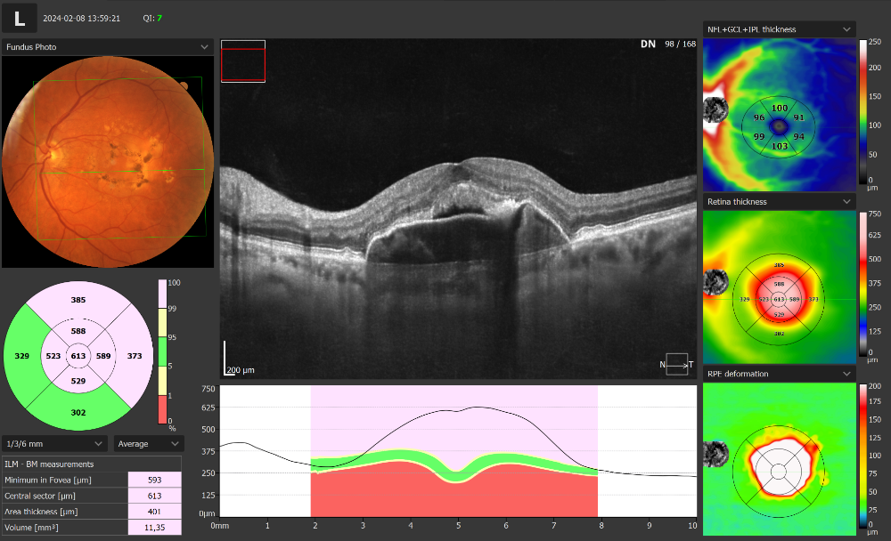 Analyse de la retine : Épaisseur de la rétine, épaisseur interne et externe de la rétine / carte d'épaisseur: RNFL+GCL+IPL, GCL+IPL, RNFL, IS/OS déformation RPE