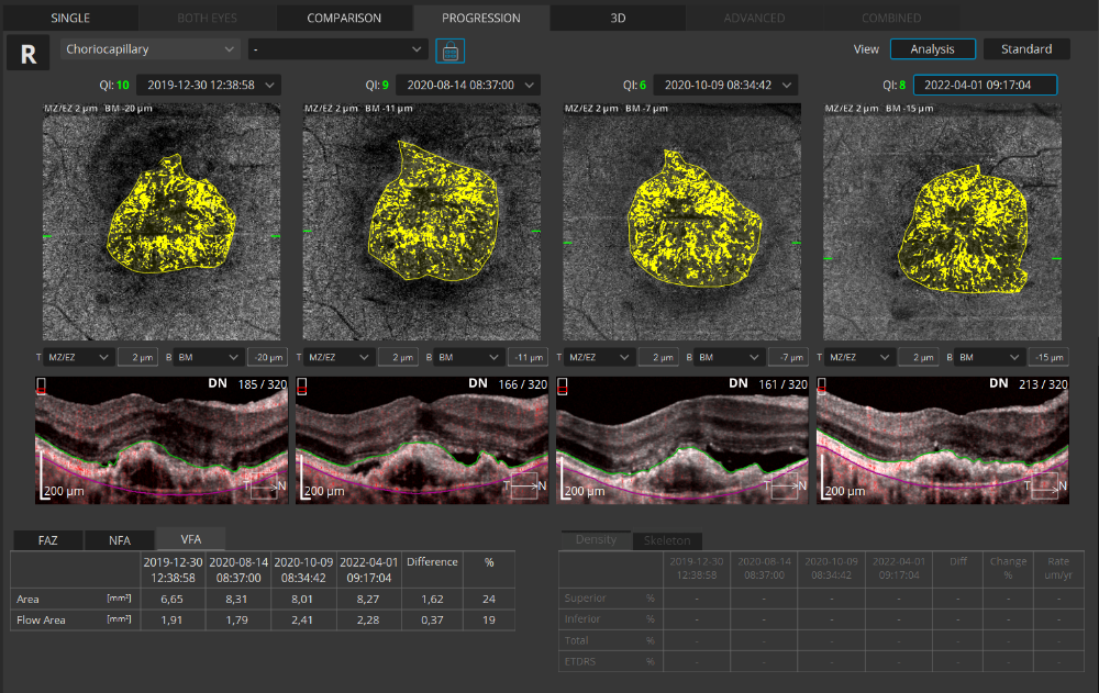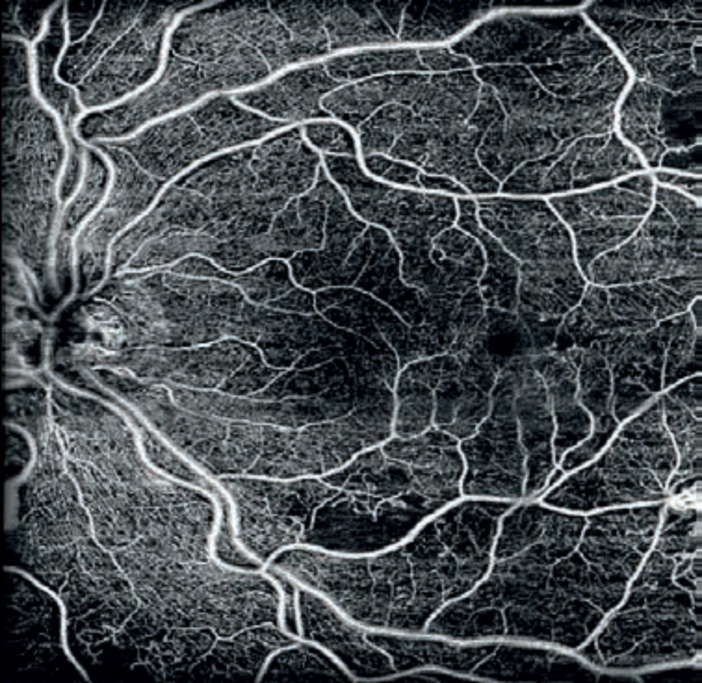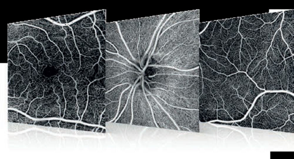 • Angiographie OCT avec fonction panoramique : ce module permet de visualiser la microvascularisation rétinienne. L'angiographie SOCT est une technique non invasive et sans colorant fournissant une image 3D de la circulation sanguine rétinienne.