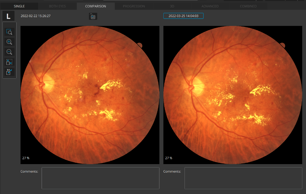 • Les modes disponibles fournissent des photos détaillées d'un ou des deux yeux, ainsi qu'une comparaison chronologique de la photo du fond d'œil.