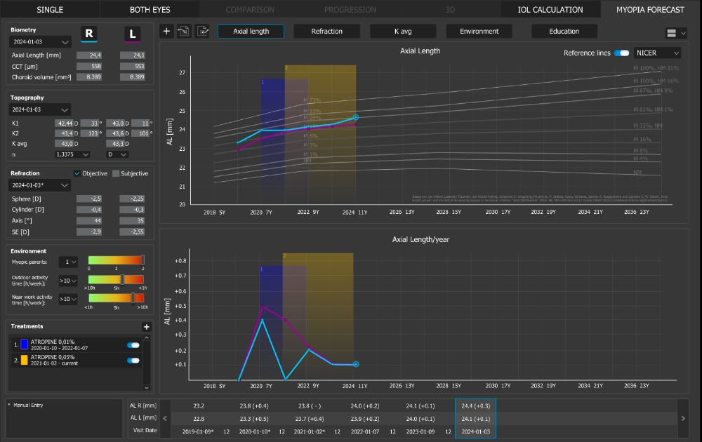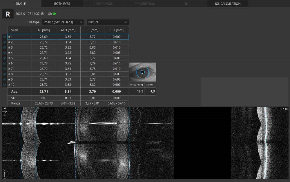 • Biométrie OCT : B-OCT® est une méthode innovante d'utilisation du dispositif OCT postérieur pour mesurer la structure oculaire le long de l'axe de l'œil. Un calculateur IOL est également disponible.