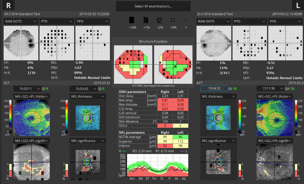 • Glaucome : Structure et Fonction pour la combinaison des résultats du REVO HR et du champ visuel PTS.