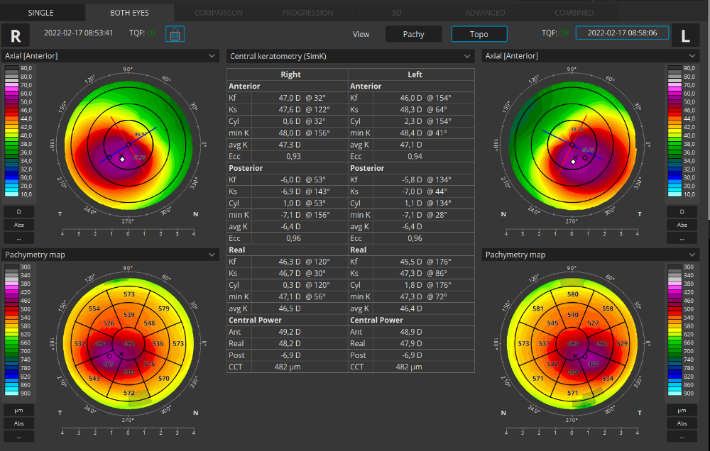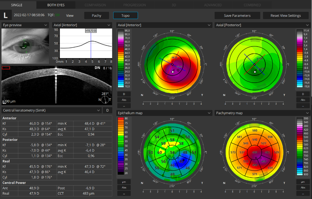 • Topographie OCT : le module Topographie OCT fournit l'analyse des deux surfaces en fonction de la courbure cornéenne, de la puissance dioptrique, de l'élévation et de l'analyse de la puissance réelle en fonction des surfaces et de l'épaisseur locale de la cornée (Ray tracing).